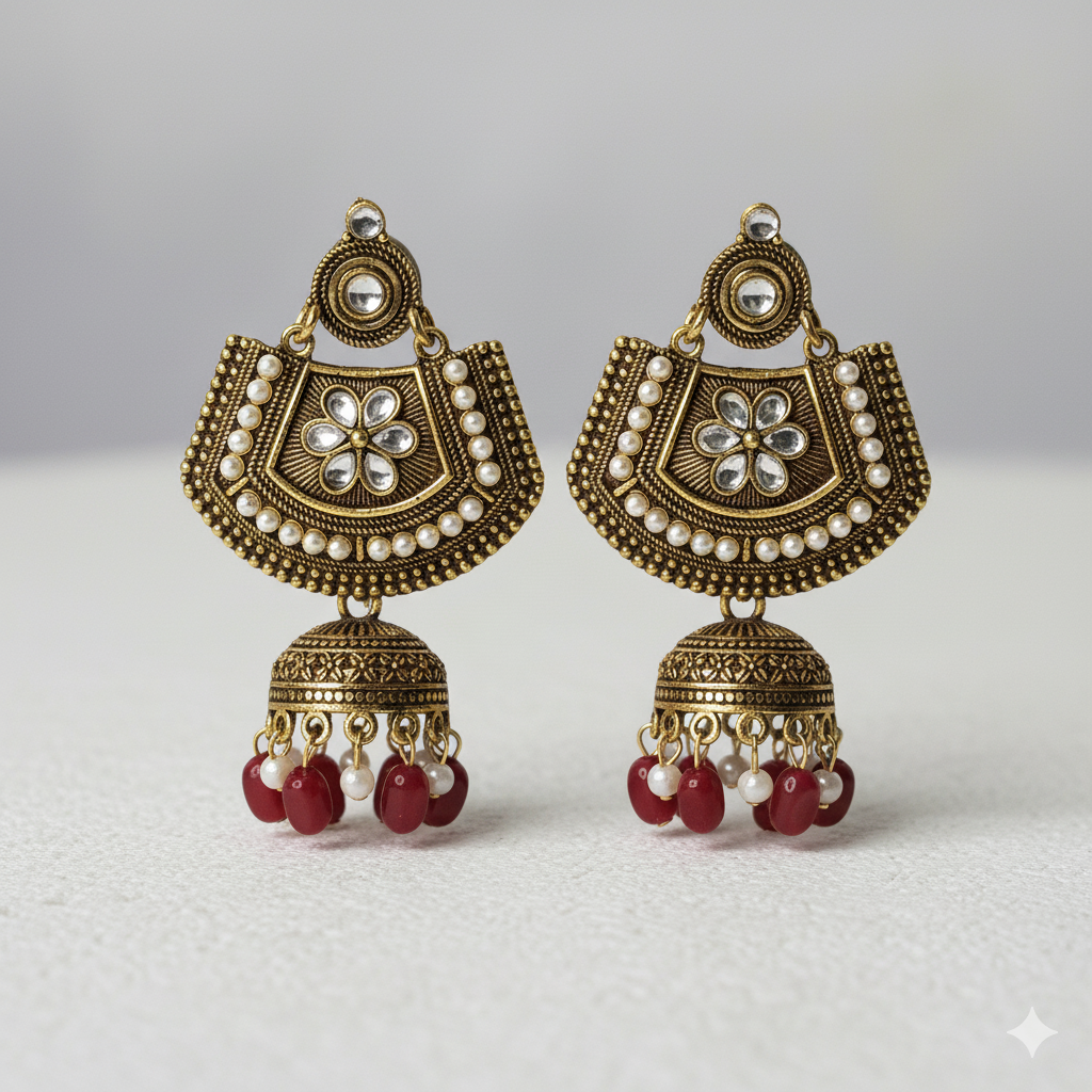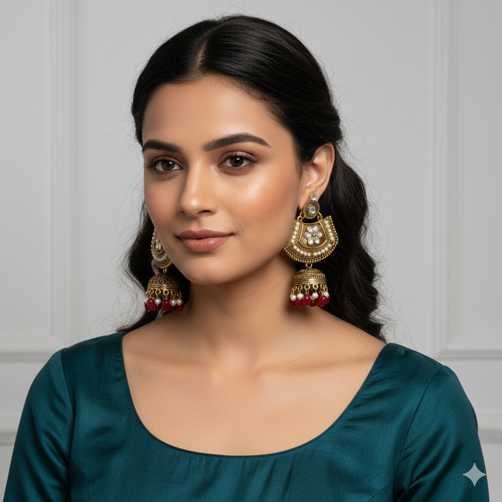 Crafted with lightweight imitation materials, these jhumkas are comfortable for long wear. Moreover, the large drop design gives a graceful touch, making them suitable for sarees, lehengas, or Indo-Western outfits.