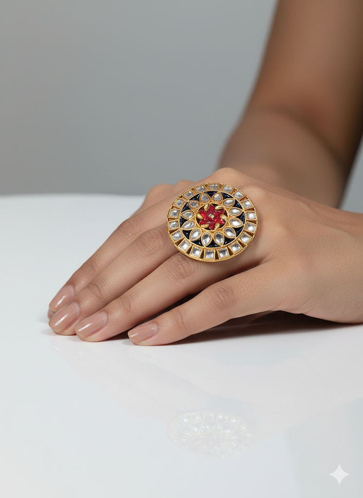 The adjustable design ensures a perfect fit for any finger size, making it an ideal accessory for parties, festive events, and casual outings. Its versatile gold-toned plating complements both ethnic and western outfits, adding a graceful touch to your look.