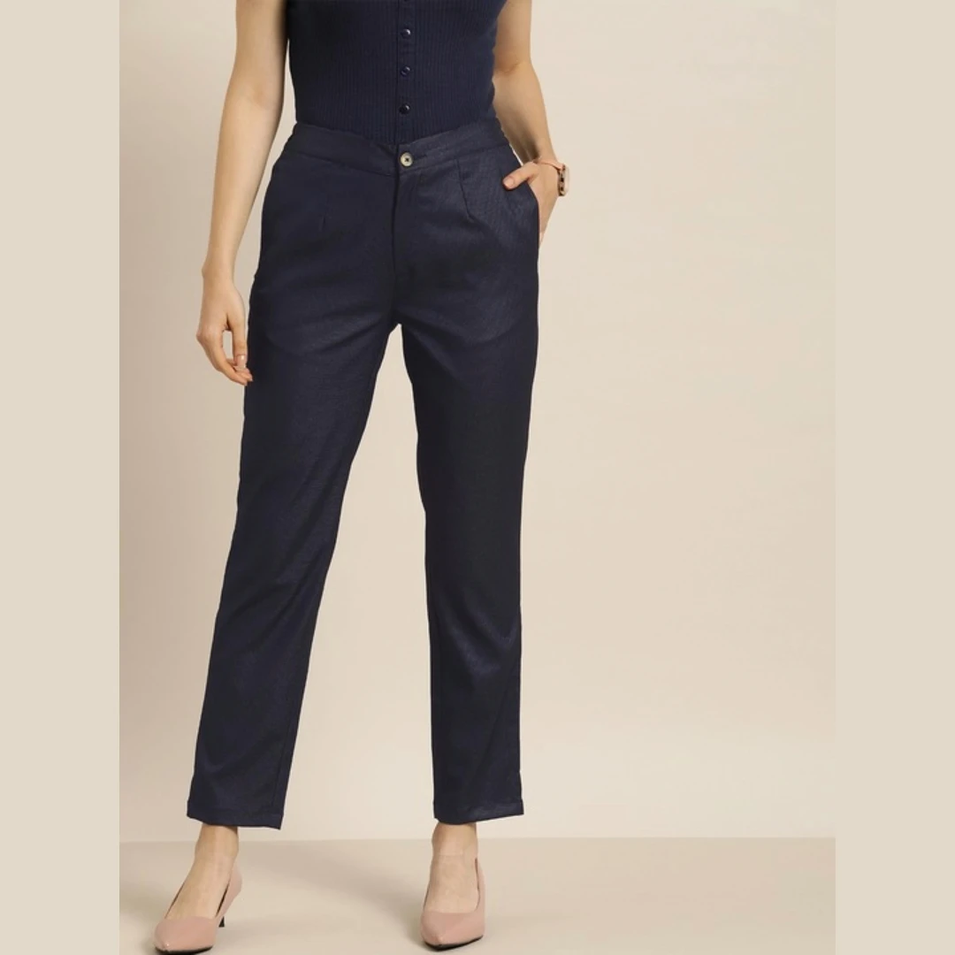 Discover timeless elegance and unparalleled comfort with our Women Navy Blue Textured Trousers. Crafted with meticulous attention to detail, these trousers are designed to elevate your wardrobe with sophistication and versatility.